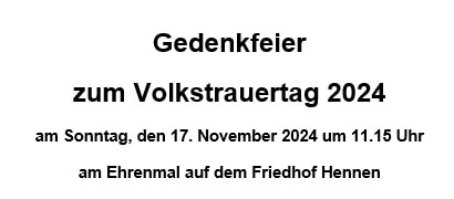 am Sonntag, den 17. November 2024 um 11.15 Uhram Ehrenmal auf dem Friedhof Hennen PROGRAMM Musikvortrag Posaunenchor Hennen Gedenkrede Pfarrer